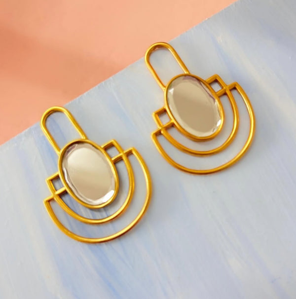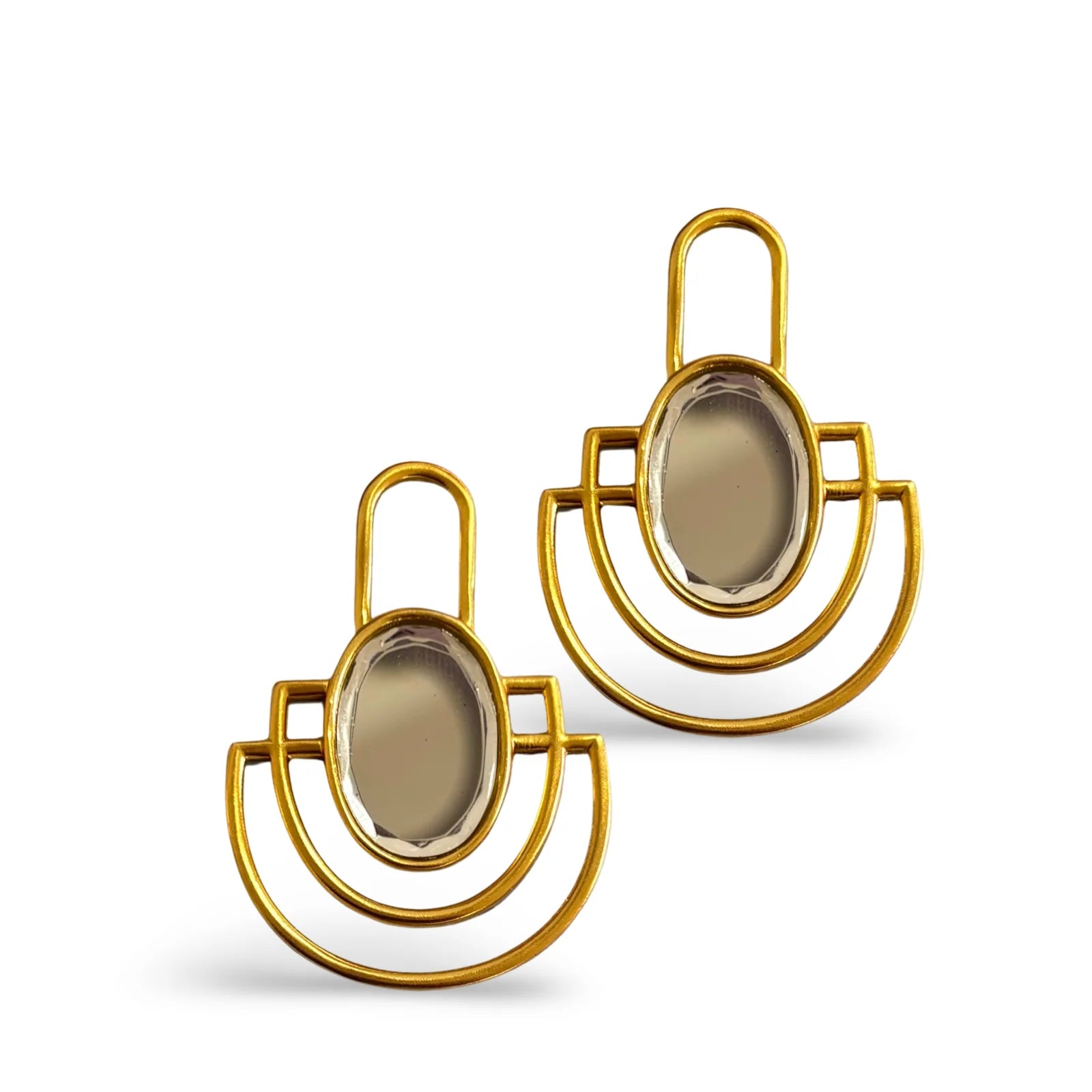 Bold mirrored centers meet cascading golden arcs, creating a statement that reflects both light and style. Modern, artistic, and eye-catching—perfect for elevating any look.