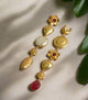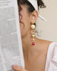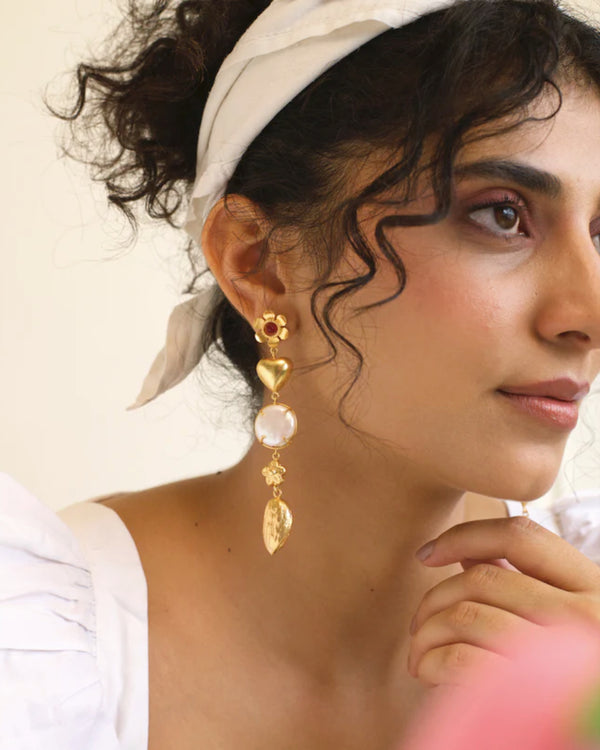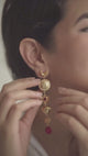 These fusion earrings of celestial and natural symbols feature a radiant sun and crescent moon, representing cosmic harmony alongside delicate flower shapes. Almond accents evoke earthly beauty, while a luminous white pearl symbolizes wisdom and purity. The rich red jade, embodying strength and passion, creates a striking contrast. Together, they tell a story of balance—between the heavens and the earth, light and shadow, spirit and nature.
